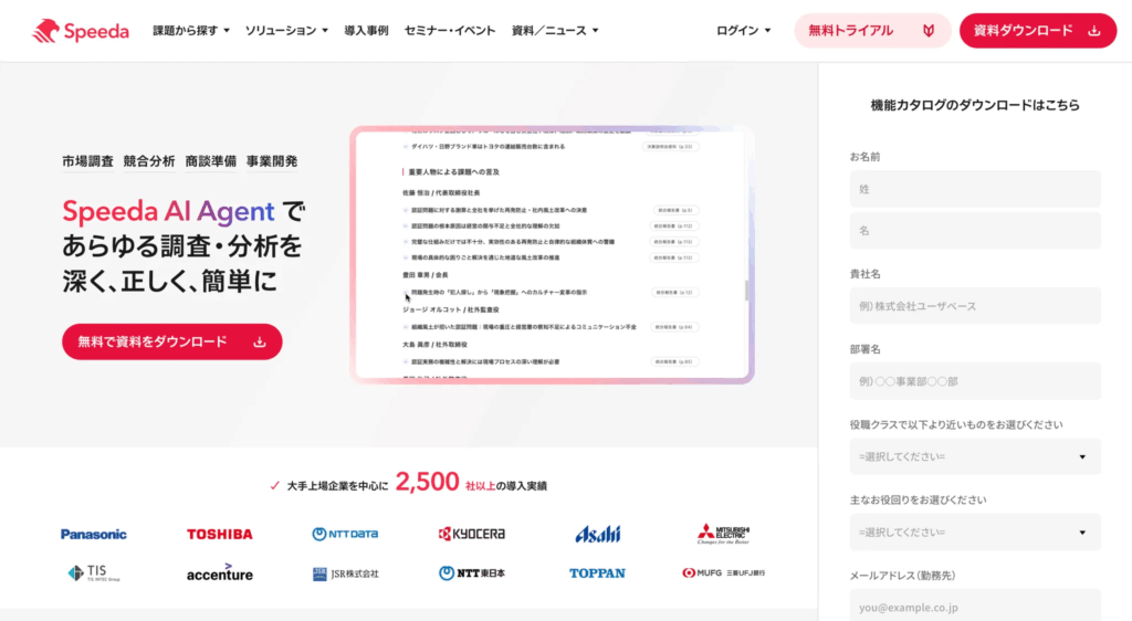 また、100以上のシナリオから適切なターゲットリストを作成できる機能があり、精度の高いリスト作成が可能。企業情報や財務データ、人物情報などを活用して、キーマンへの効果的なアプローチを設計できます。加えて、生成AI機能「Speeda AI Agent」を搭載しており、業界分析や企業調査、提案準備などの業務を自動化・高速化。