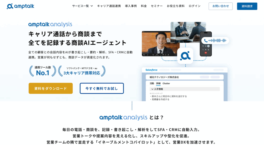 amptalk株式会社が提供する、電話・商談解析ツール。Zoom PhoneやDialpadなどのIP電話、Zoom Meetingsなどのテレビ会議システムと連携し、架電内容を自動で録音・書き起こし・解析します。