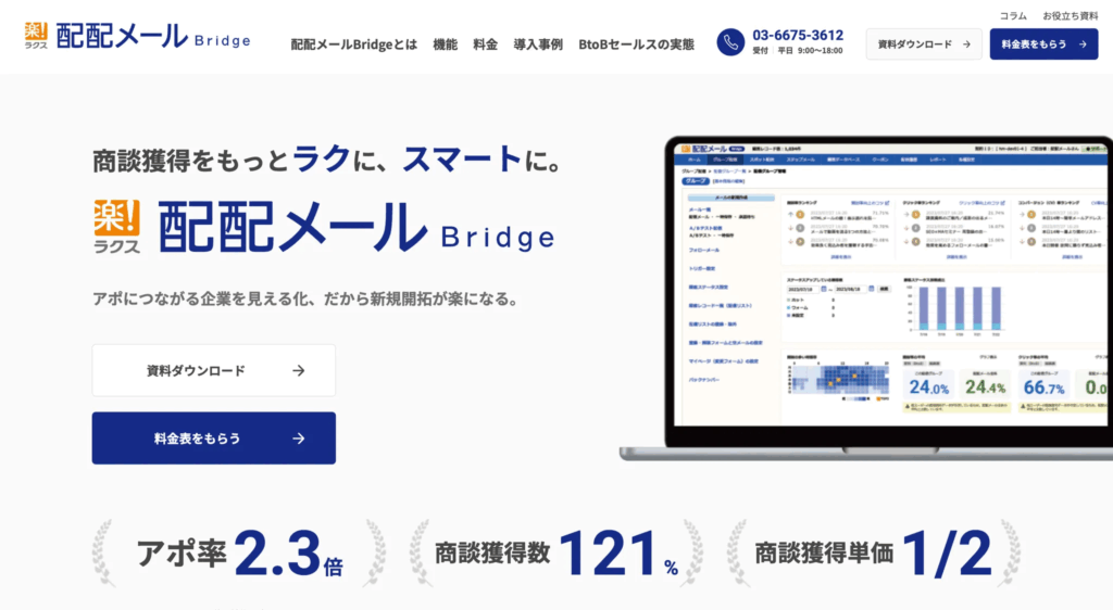 さらに、国内最大級の企業データベース「BIZMAPS」からエリア・業種・売上高などで絞り込んだ企業リストをダウンロード可能。リスト作成の工数を削減しながら、質の高いターゲットリストにアプローチできます。Salesforceやkintoneとノーコードで連携し、メール配信結果やWeb来訪データを自動で同期。5ヶ月間の無償導入支援があり、初めてのメールマーケティングでも安心です。