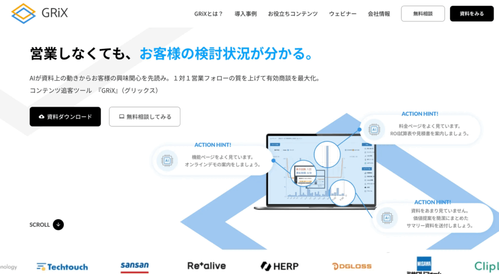 AIが閲覧データをもとに次にすべき営業アクションを提示してくれるため、「この顧客にいつ連絡すべきか」「資料を再送すべきか」といった判断が容易になります。SalesforceやHubSpot、Pardot、Marketoなど主要なMA・SFAと連携可能で、追加工数なく利用できます。