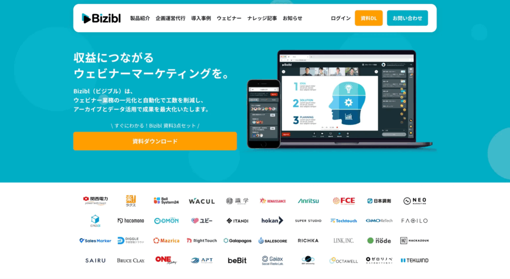 株式会社Bizibl Technologiesが提供する、ウェビナーマーケティングSaaS。告知ページから申込フォーム、ウェビナー開催、アンケートまで一元管理でき、ウェビナー運営の工数を大幅に削減します。