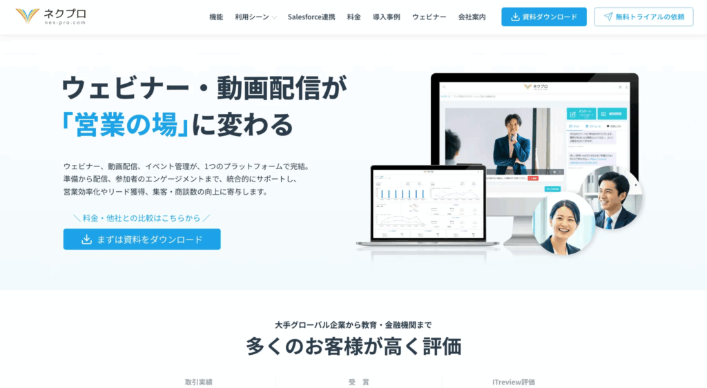 株式会社ネクプロが提供する、ウェビナー・動画配信プラットフォーム。申込管理、メール配信、ウェビナー配信、アンケート、分析、MA連携まで、ウェビナー運営に必要な機能をオールインワンで提供します。