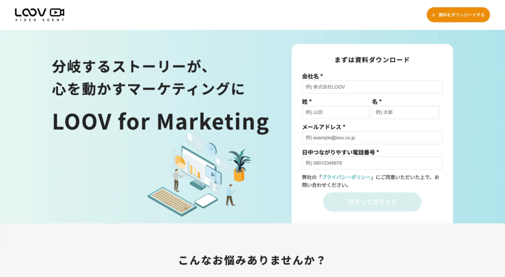 株式会社LOOVが提供する、Video Agent(インタラクティブ動画)作成プラットフォーム。動画内に設問やフォームを設置し、視聴者の回答に応じて内容が自動で変化する動画を最短15分で作成できます。