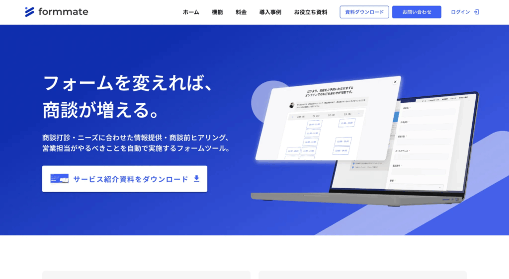株式会社Coneが提供する、商談獲得に特化したBtoBフォーム作成ツール。見込み顧客がformmateで作成したフォームを送信すると、サンクスページに営業担当の空き日程が表示され、その場でオンライン商談の予約が可能です。待っているだけで営業担当のカレンダーに商談が入る、というイメージ。