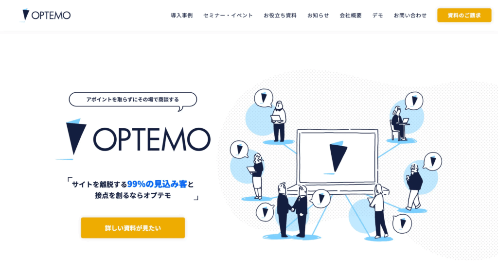 株式会社OPTEMOが提供する、WEBサイト上で訪問者とリアルタイムに商談できるインサイドセールスツール。自社サイトを閲覧している見込み顧客の画面を確認しながら、その場でチャットや音声通話を開始できます。