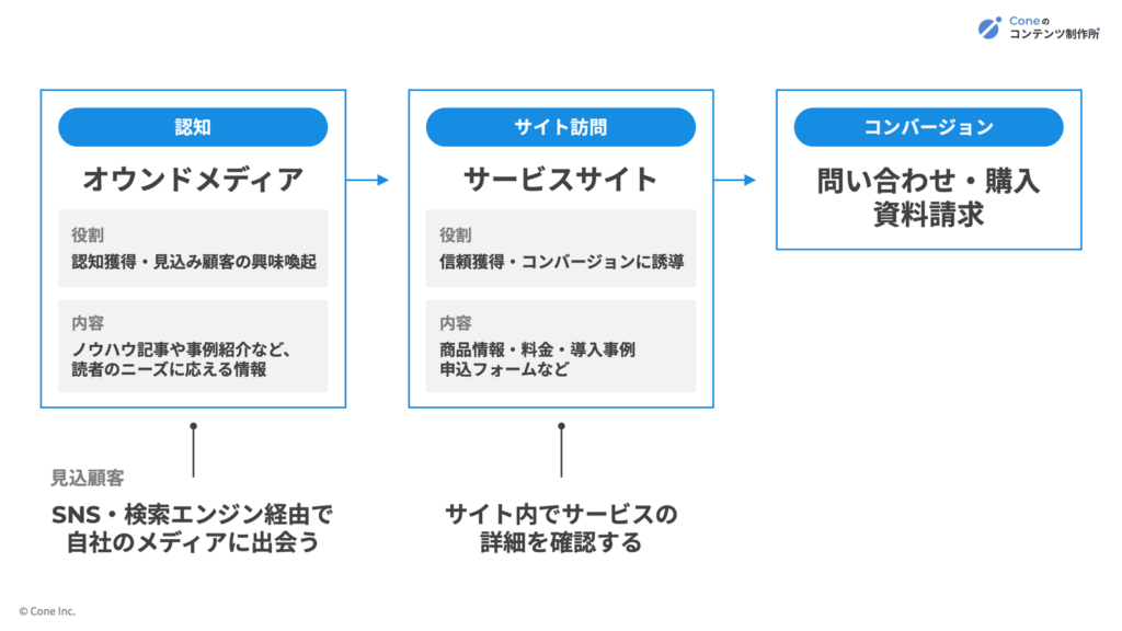 この認知を獲得するのがオウンドメディアというわけです。つまり、オウンドメディアは認知や興味を生むトリガーであり、サービスサイトはその興味をCV(問い合わせ・資料請求)につなげる装置という関係性にあります。