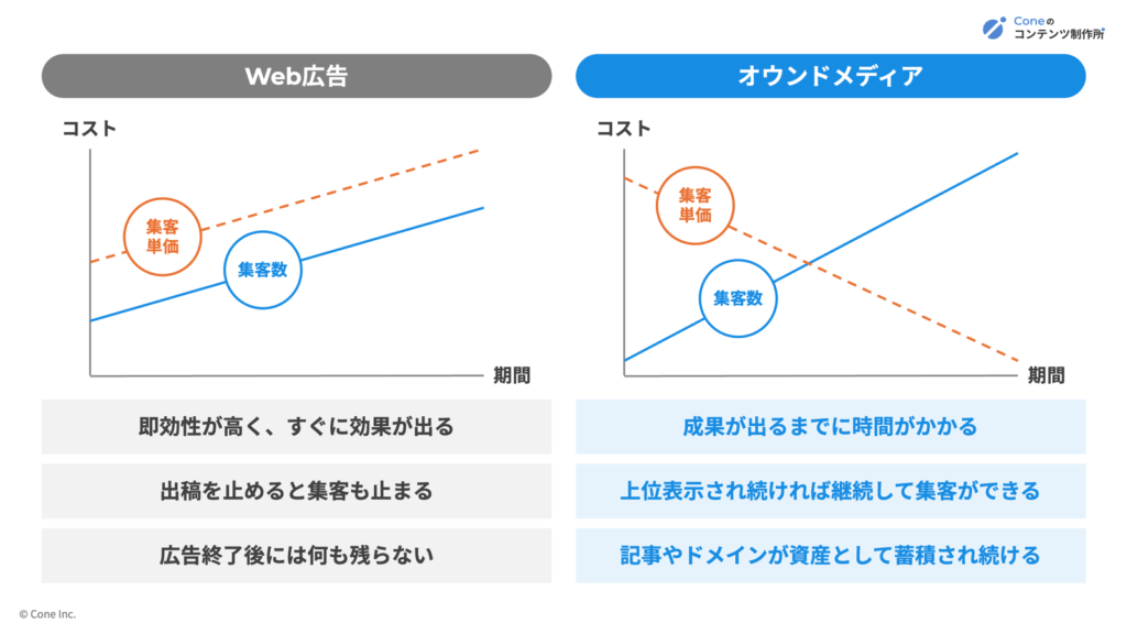 オウンドメディアはその逆で、成果が出るまでに時間はかかるものの、一度上位表示された記事や蓄積されたコンテンツが、安定的にCVを生み続ける資産になります。