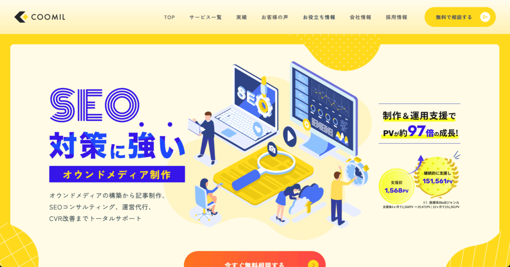 美容、医療、求人、不動産、金融、飲食、士業など多様なジャンルでの豊富な実績を持ち、記事制作やオウンドメディア構築、SEOコンサルティングまで一貫したサービスが特徴です。