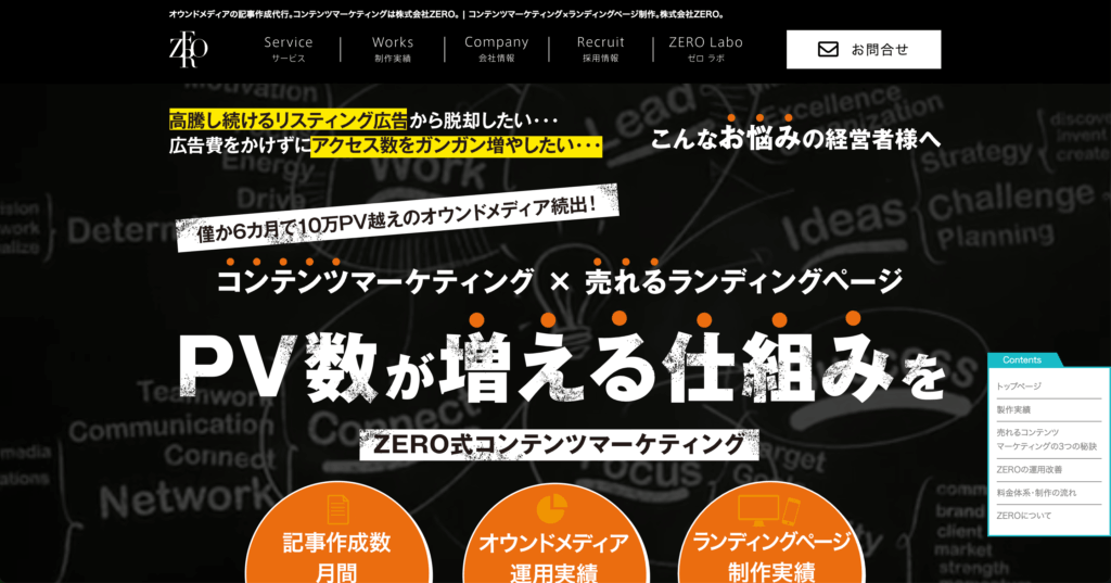 株式会社ZEROは、ヒアリングからの詳細な分析をもとに、集客最大化を目指したコンテンツ制作とサイト設計を行い、単なる制作に留まらず、ツール活用やABテストによる継続的な改善提案を実施するとともに、Web課題の洗い出しや目的設定の再確認を通じて最適なページ制作を実現します。