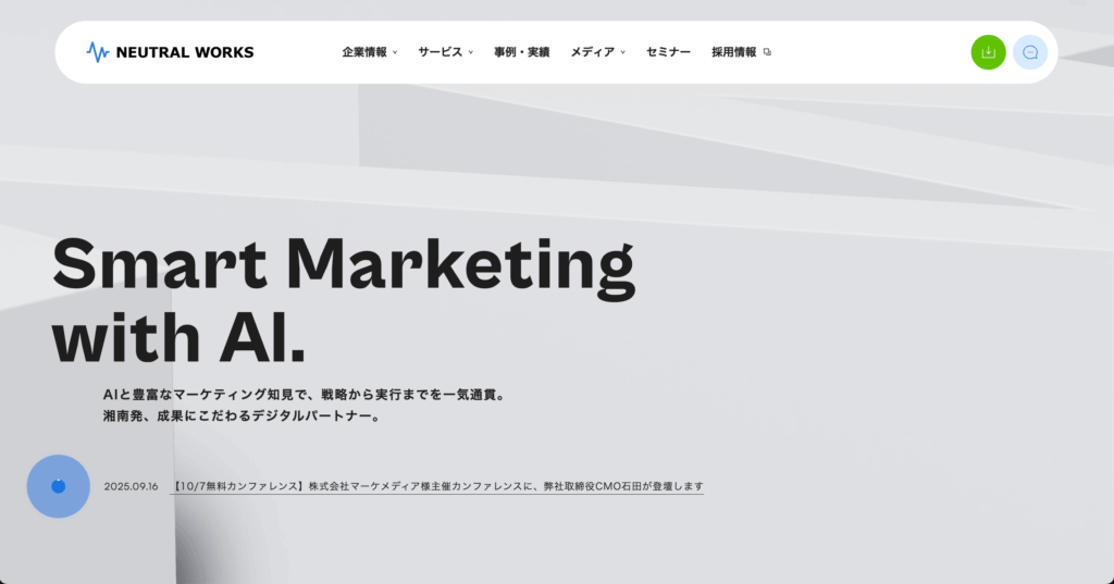 株式会社ニュートラルワークスは、Web制作からSEO対策、コンテンツ制作、リード獲得のための導線設計に至るまで、ワンストップで高品質なサービスを提供しています。自社オウンドメディアの運用実績を活かし、激戦領域の難関キーワードでの上位表示実績や、UI/UX改善による問い合わせ増加を実現しています。
