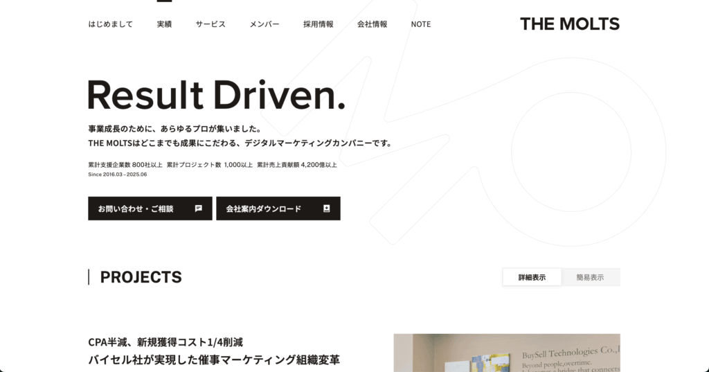 株式会社THE MOLTSは、総合的な視点からマーケティング統合型のオウンドメディア制作支援を行う会社です。クライアントの事業課題に合わせて完全カスタマイズされた戦略設計から施策代行までを柔軟に提供し、単なるコンテンツ制作に留まらず、インハウス化支援や運用代行を含む幅広いサポート体制を特徴としています。